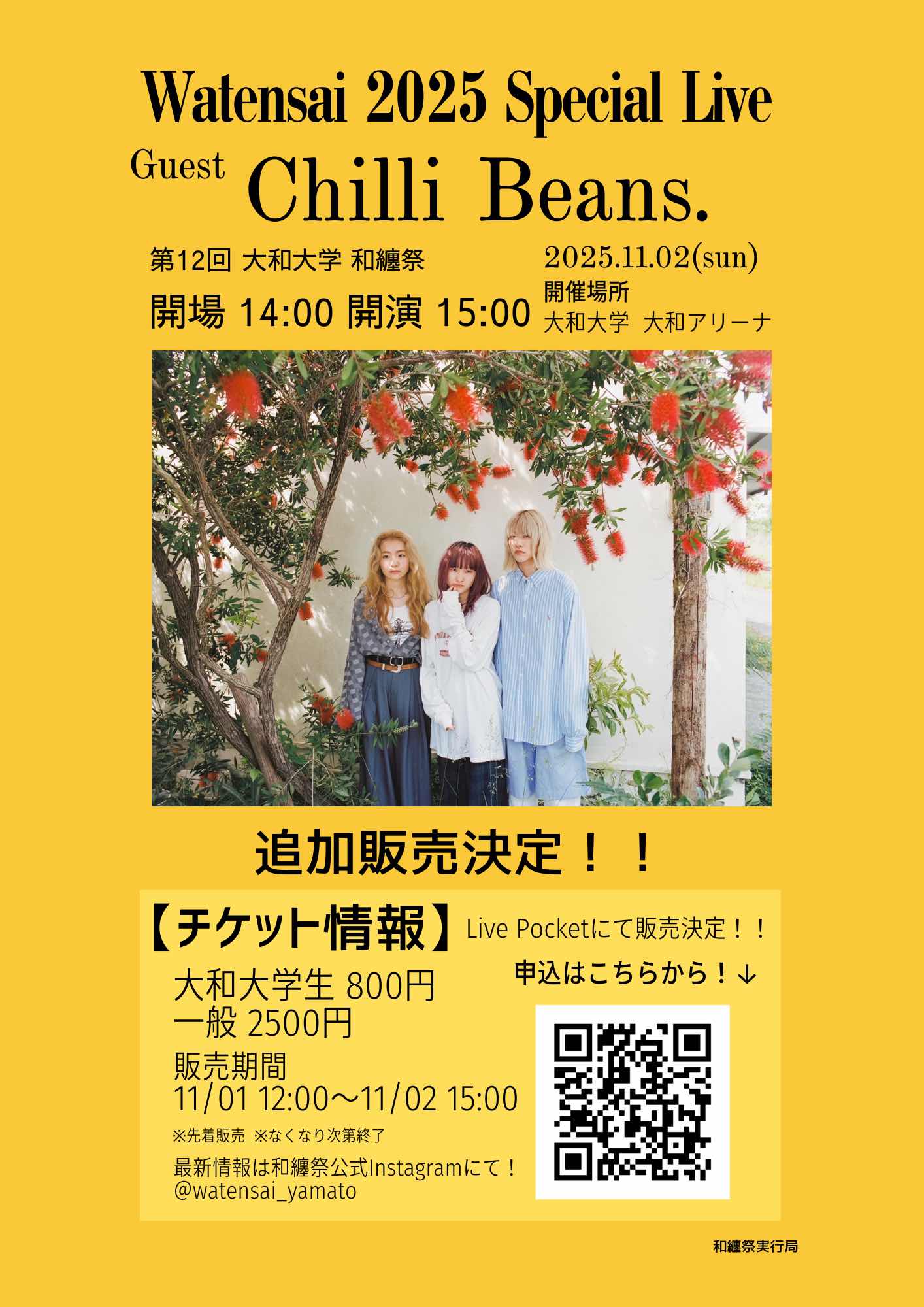 Moto(Vo)、Maika(Ba&Vo)、Lily(Gt&Vo)により、2019年に結成された3ピースバンド。2025年11月には韓国開催のフェスへの出演、12月には台湾で初となるワンマンライブ開催も決定しています。等身大で自由に表現される楽曲やライブパフォーマンスで人気を集めている「Chilli Beans.」が和纏祭に出演決定!!開催日時:2025年11月2日(日) 開場14:00 開演15:00開催場所:大和大学 大和アリーナ<チケット情報>追加販売決定!!大和大学生:800円 一般:2500円販売期間:11月1日(土)12:00〜2日(日)15:00※先着販売 ※なくなり次第販売終了Live Pocketに加え、和纒祭開催中は本部テントでもチケットを販売いたします!※先着販売 ※本部での販売は現金のみ及び整理番号制になります。 最新情報は和纒祭実行局公式Instagramをチェック!購入ページはこちら⇒https://t.livepocket.jp/e/watensai2025